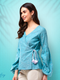 Elevate your summer essentials with this Pannkh Chambray top. Featuring angarkha style bodice having side dori tie-up and extended puff sleeves with elastic. Team it up with pants, skirts, and a pair of pumps.