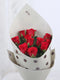| 11 Red Roses Beige Color Brown Polka Dot Wrapping Paper Tied with fnp golden Ribbon Green Morpankhi Leaf Filler |