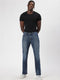 Men's dark indigo straight jeans that sit comfortably at the waist with narrow leg openings. They fit fuller through the hip and thigh and run straight from hip to ankle. They feature a deep green back pocket that says - ‘I carry ~3600 litres of saved water in this pocket.’