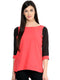 Pannkh color block top with boat neckline , quarter sleeves and a relaxed fit.