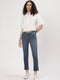 Women's dark indigo straight jeans that sit low on waist with narrow leg openings. They fit fuller through the hip and thigh and run straight from hip to ankle. They feature a deep green back pocket that says - ‘I carry ~3600 litres of saved water in this pocket.’