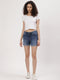 Women's dark indigo straight denim shorts that sit low on waist with narrow leg openings. They fit fuller through the hip and thigh and run straight from hip to hem. They feature a deep green back pocket that says - ‘I carry ~3600 litres of saved water in this pocket.’