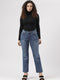 Women's dark indigo straight jeans that sit comfortably at the waist with narrow leg openings. They fit fuller through the hip and thigh and run straight from hip to ankle. They feature a deep green back pocket that says - ‘I carry ~3600 litres of saved water in this pocket.’