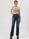 Women's dark indigo straight jeans that sit comfortably at the waist with narrow leg openings. They fit fuller through the hip and thigh and run straight from hip to ankle. They feature a deep green back pocket that says - ‘I carry ~3600 litres of saved water in this pocket.’