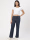 Women's dark indigo straight jeans that sit comfortably at the waist with narrow leg openings. They fit fuller through the hip and thigh and run straight from hip to ankle. They feature a deep green back pocket that says - ‘I carry ~3600 litres of saved water in this pocket.’