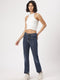 Women's dark indigo straight jeans that sit comfortably at the waist with narrow leg openings. They fit fuller through the hip and thigh and run straight from hip to ankle. They feature a deep green back pocket that says - ‘I carry ~3600 litres of saved water in this pocket.’