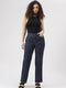 Women's dark indigo straight jeans that sit comfortably at the waist with narrow leg openings. They fit fuller through the hip and thigh and run straight from hip to ankle. They feature a deep green back pocket that says - ‘I carry ~3600 litres of saved water in this pocket.’