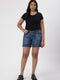 Women's dark indigo straight denim shorts that sit comfortably at the waist with narrow leg openings. They fit fuller through the hip and thigh and run straight from hip to hem. They feature a deep green back pocket that says - ‘I carry ~3600 litres of saved water in this pocket.’