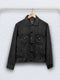 Men's black trucker denim jacket. An iconic jacket style with a slim casual cut, spread collar, pointed flap chest pockets, button tab waist adjusters, and two V-shaped seams that run from chest pocket to waist. It features a large earthy green backpack pocket.