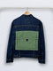 Men's dark indigo trucker denim jacket. An iconic jacket style with a slim casual cut, spread collar, pointed flap chest pockets, button tab waist adjusters, and two V-shaped seams that run from chest pocket to waist. It features a large earthy green backpack pocket.