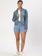 Women's dark indigo denim jacket. An iconic jacket style with a slim casual cut, spread collar, pointed flap chest pockets, button tab waist adjusters, and two V-shaped seams that run from chest pocket to waist. It features a deep green pocket that says - ‘I pledge to waste less, crave less, use less and reuse more. I pledge to rescue our future.'
