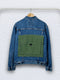 Men's dark indigo trucker denim jacket. An iconic jacket style with a slim casual cut, spread collar, pointed flap chest pockets, button tab waist adjusters, and two V-shaped seams that run from chest pocket to waist. It features a large earthy green backpack pocket.