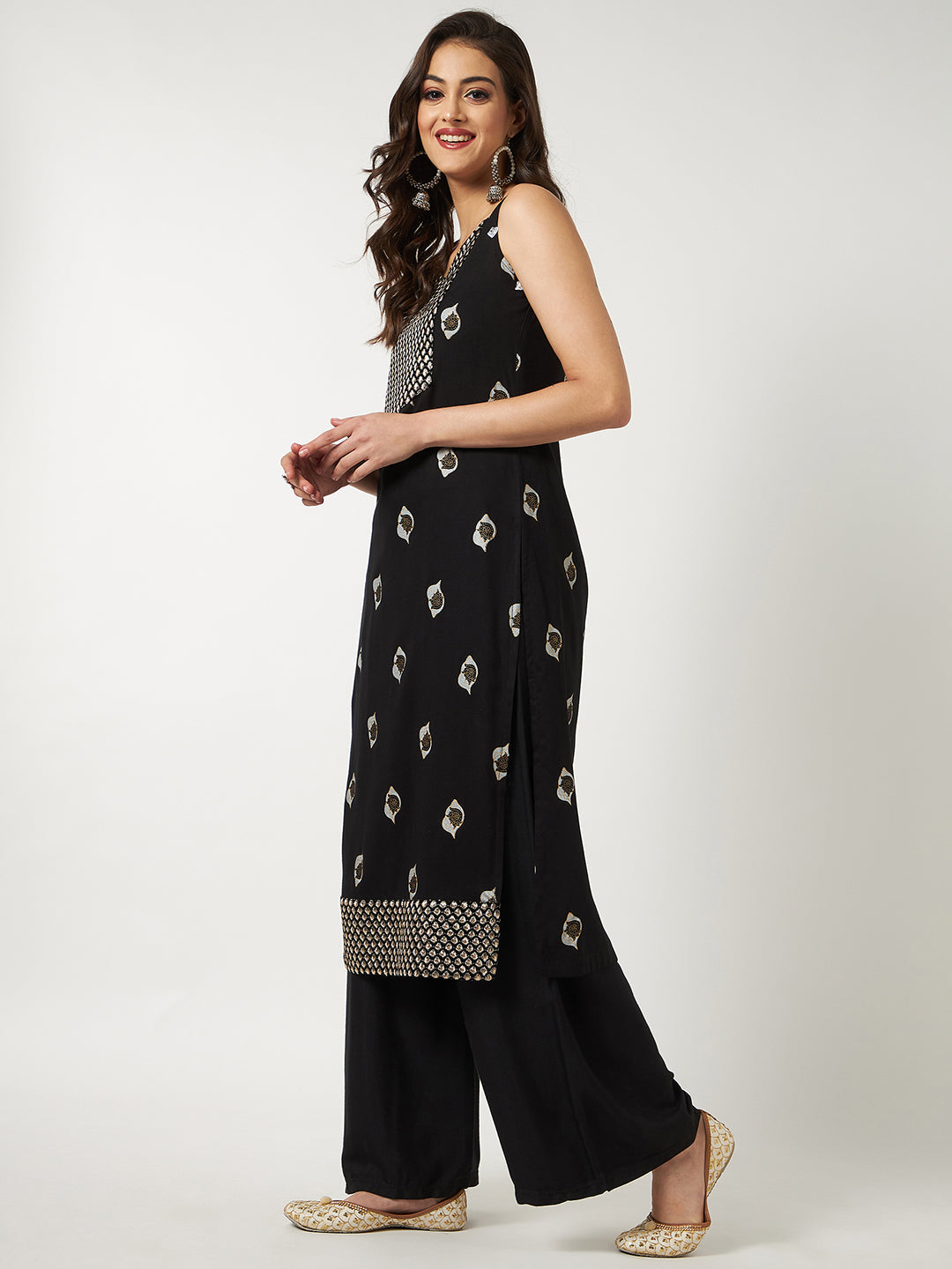 | Enjoy the ethnicity with our black color sleeveless kurta with brocade yoke having round neckline . Team it up with a pair of mojari and matching pants to enhance the look. Material: Rayon Base Color : Black Color : Black Care Instruction : Hand Wash Separately Sleeves : Sleeveless Neckline : Round Neck Pattern : Printed Product Highlight : Sleeveless Kurta With Brocade Yoke Disclaimer: The product color may vary from screen resolution of the device. |
