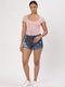 Women's dark indigo straight denim shorts that sit high on the waist with narrow leg openings. They fit fuller through the hip and thigh and run straight from hip to hem. They feature a deep green back pocket that says - ‘I carry ~3600 litres of saved water in this pocket.’